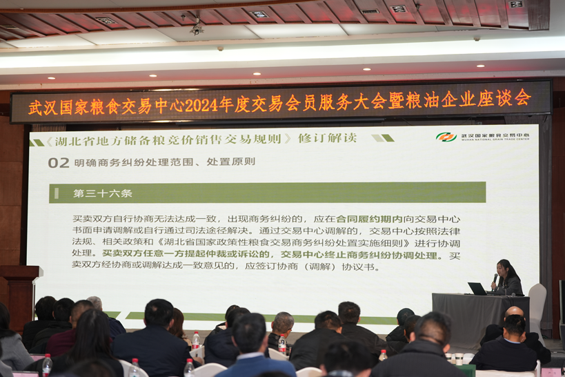 热忱服务,一片赤诚。随后农业发展银行湖北省分行粮棉油处客户经理刘小妹介绍了针对粮油企业的融资产品。交易中心交易部代书阳同志详细解读了湖北省地方储备粮竞价销售交易规则的修订以及交易监管系统运用的实例。据悉明年农发行湖北省分行与交易中心还将进一步加强合作,打造交易融资创新举措,服务全省粮油企业。